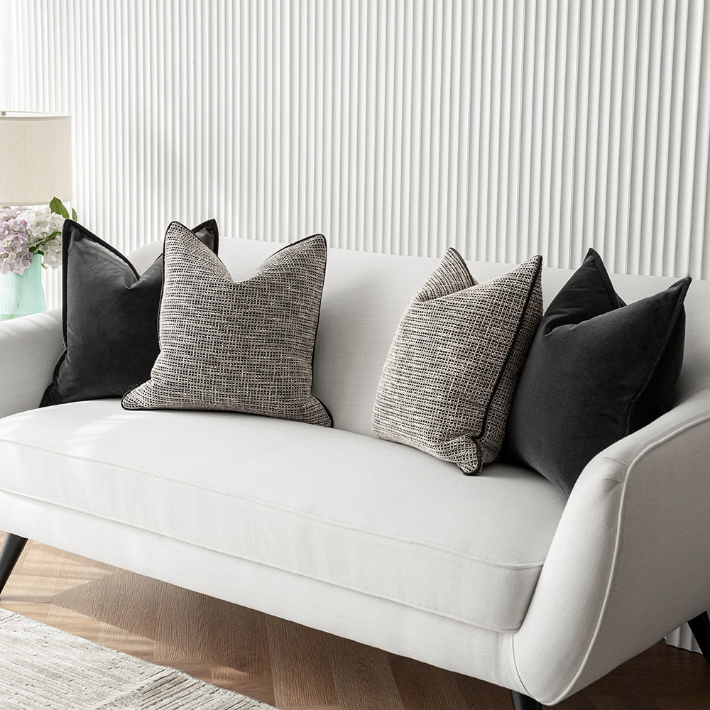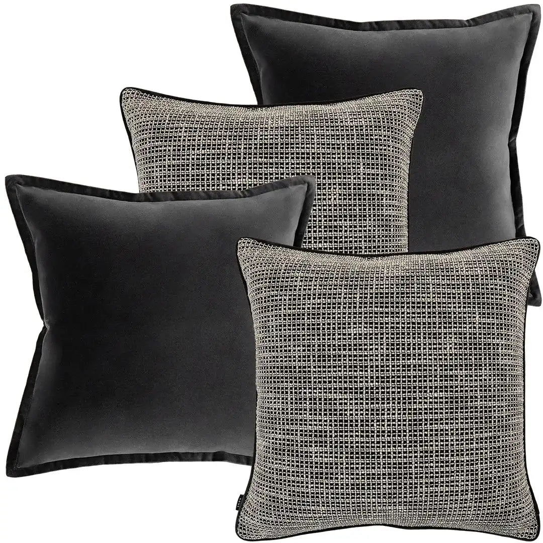 This four-piece cushion bundle comes in black, white and dark grey for a modern mood. With two velvet cushions and two highly textured jacquard cushions, this versatile set will update your interior.