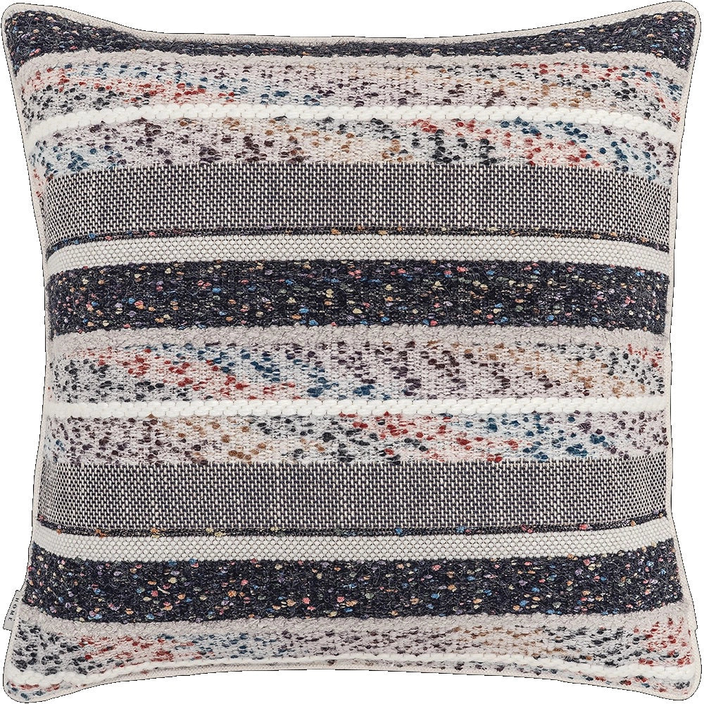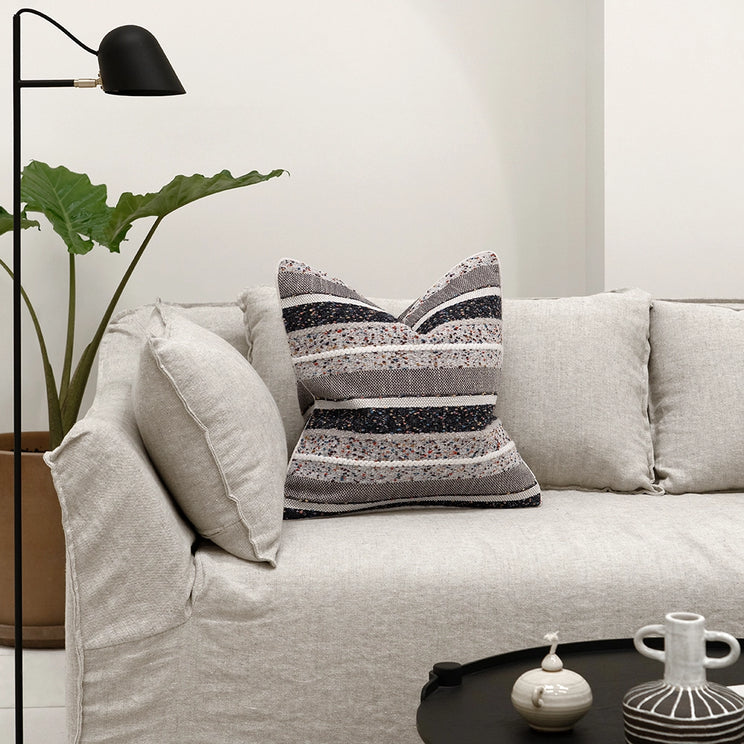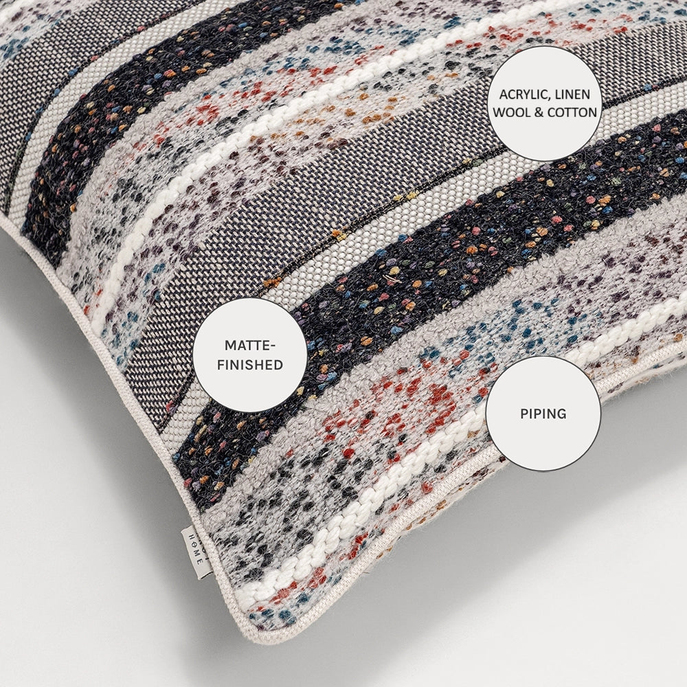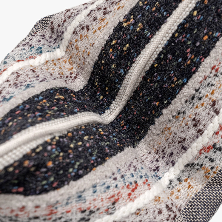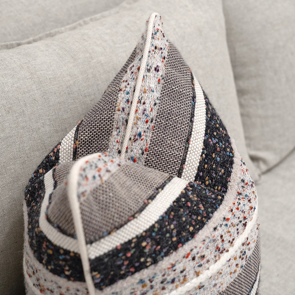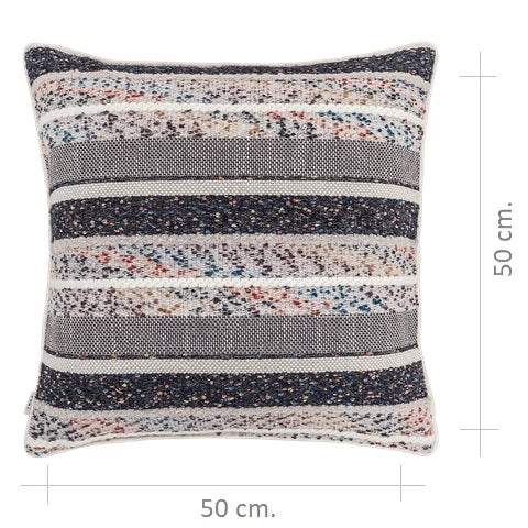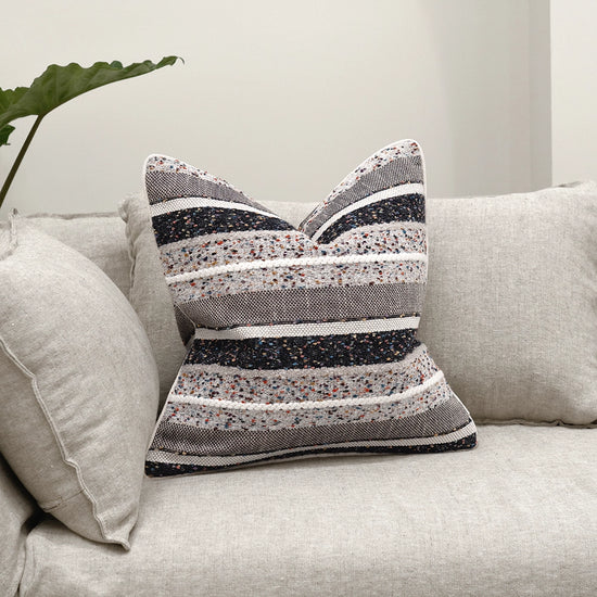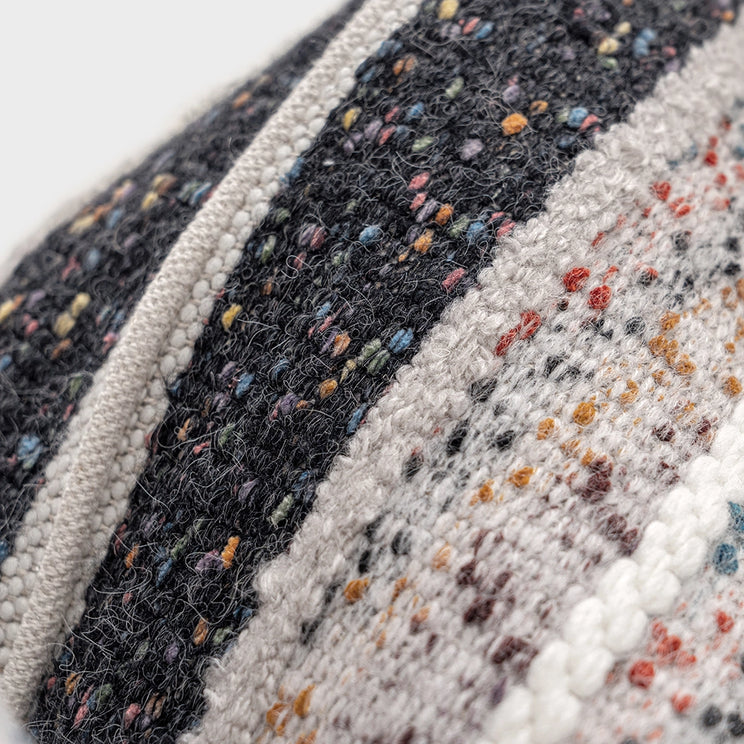 A richly woven cushion combining deep navy, ivory, and taupe stripes with speckled yarns in rust, blue, and mustard. Its multi-textured weave and handcrafted look bring depth and warmth to any space.