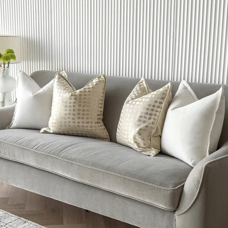 Design: Two white cushions and two metallic gold dot cushions with a velvet back
