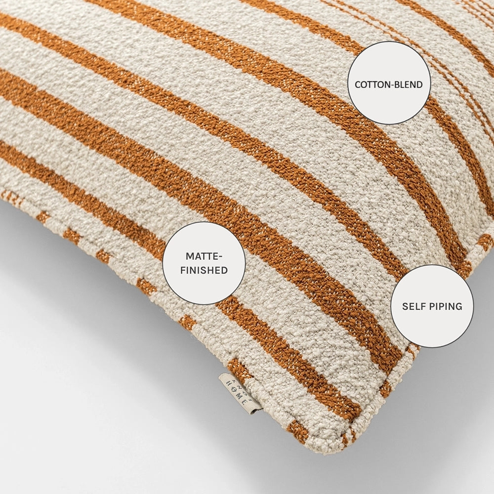 A softly textured cushion featuring deep amber-toned stripes on an ivory base. The interplay of thick and fine lines adds warmth and a relaxed, crafted elegance to any interior.