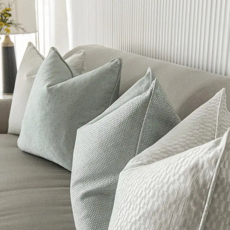 Add soft colour to your living room with this calming cushion bundle. The set includes two semi-shiny cushions with a rectangle design, paired with two pale green cushions with small squares all over.