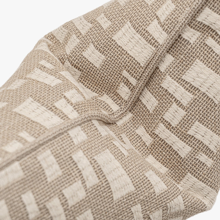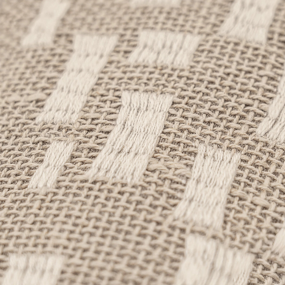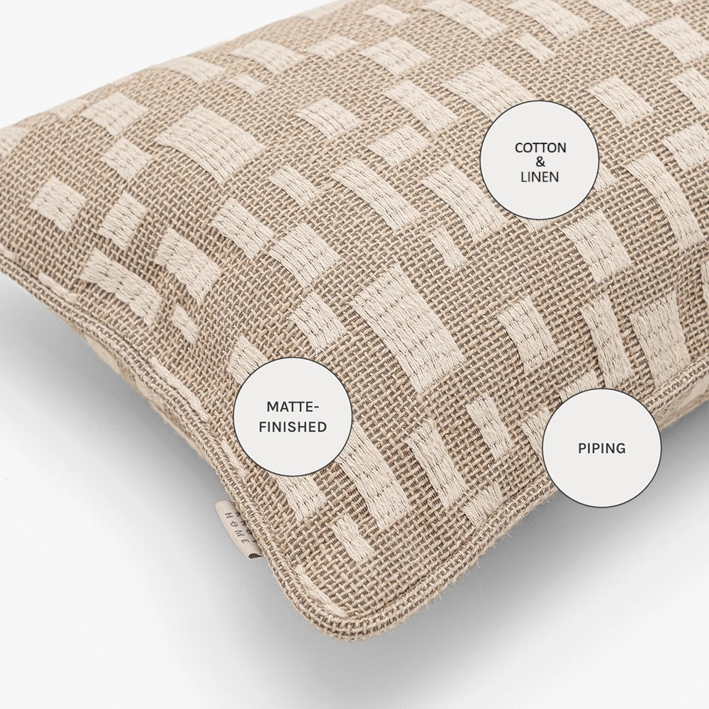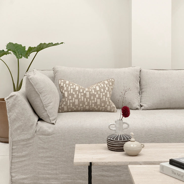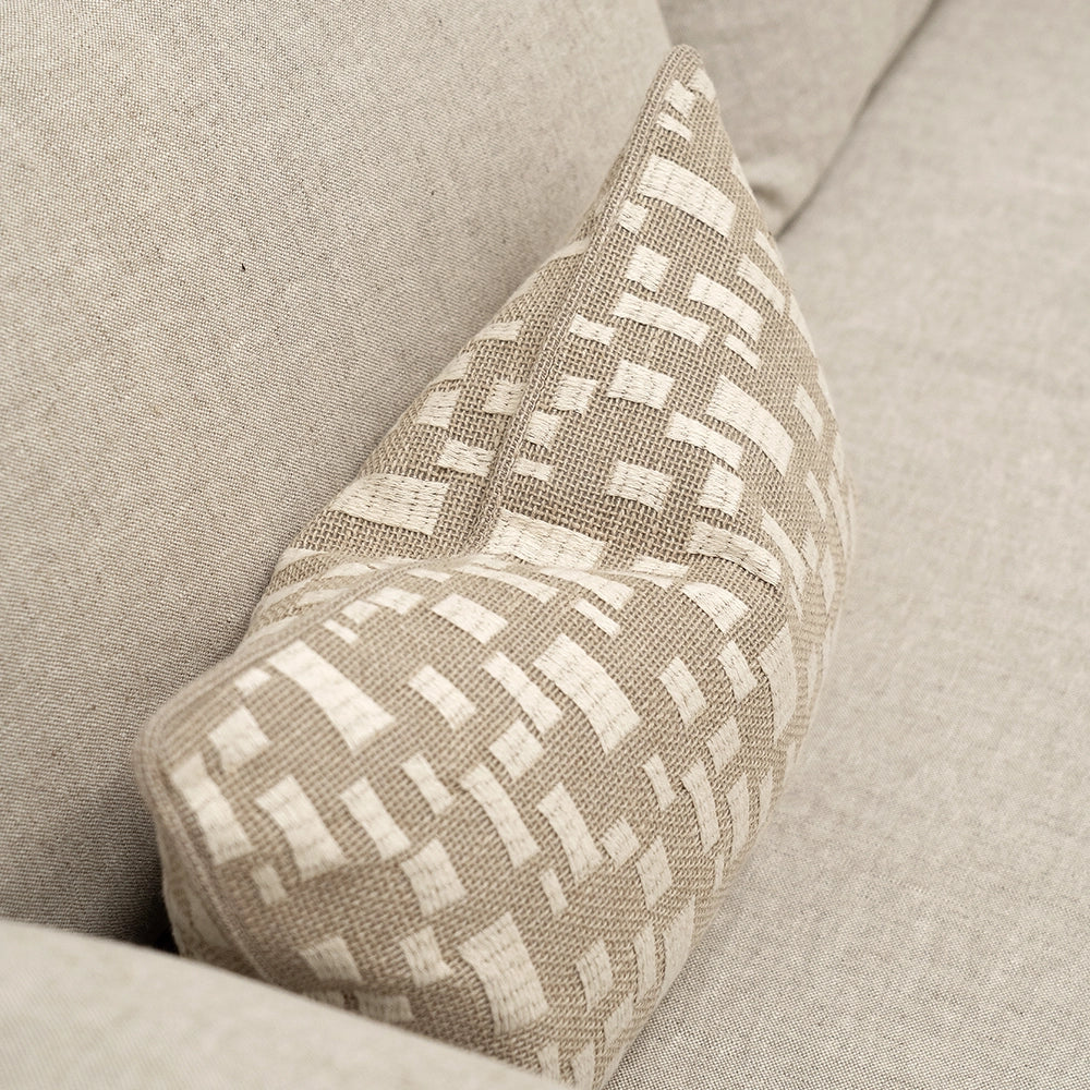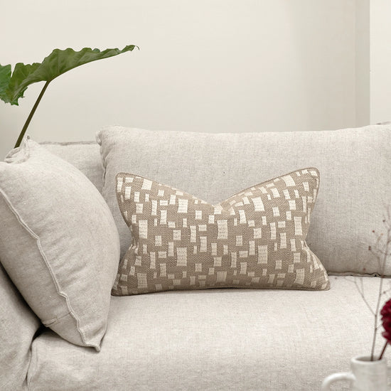 This beige cushion features a pattern of textured rectangles floating across the surface for a calming quality. Made from cotton and linen, this neutral cushion will make any sofa feel more zen.