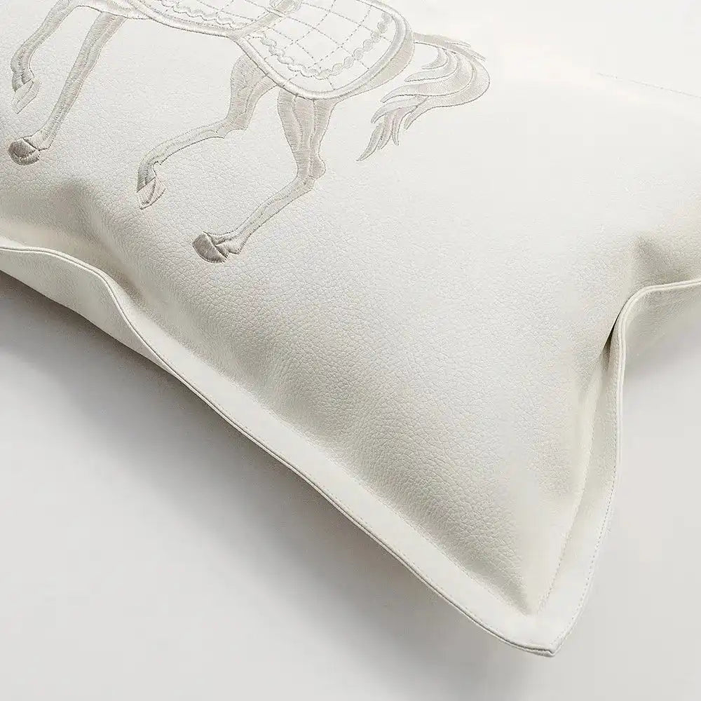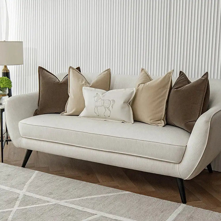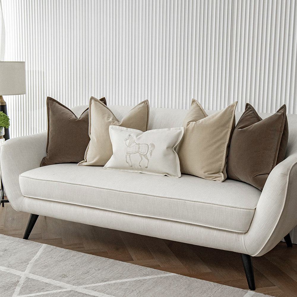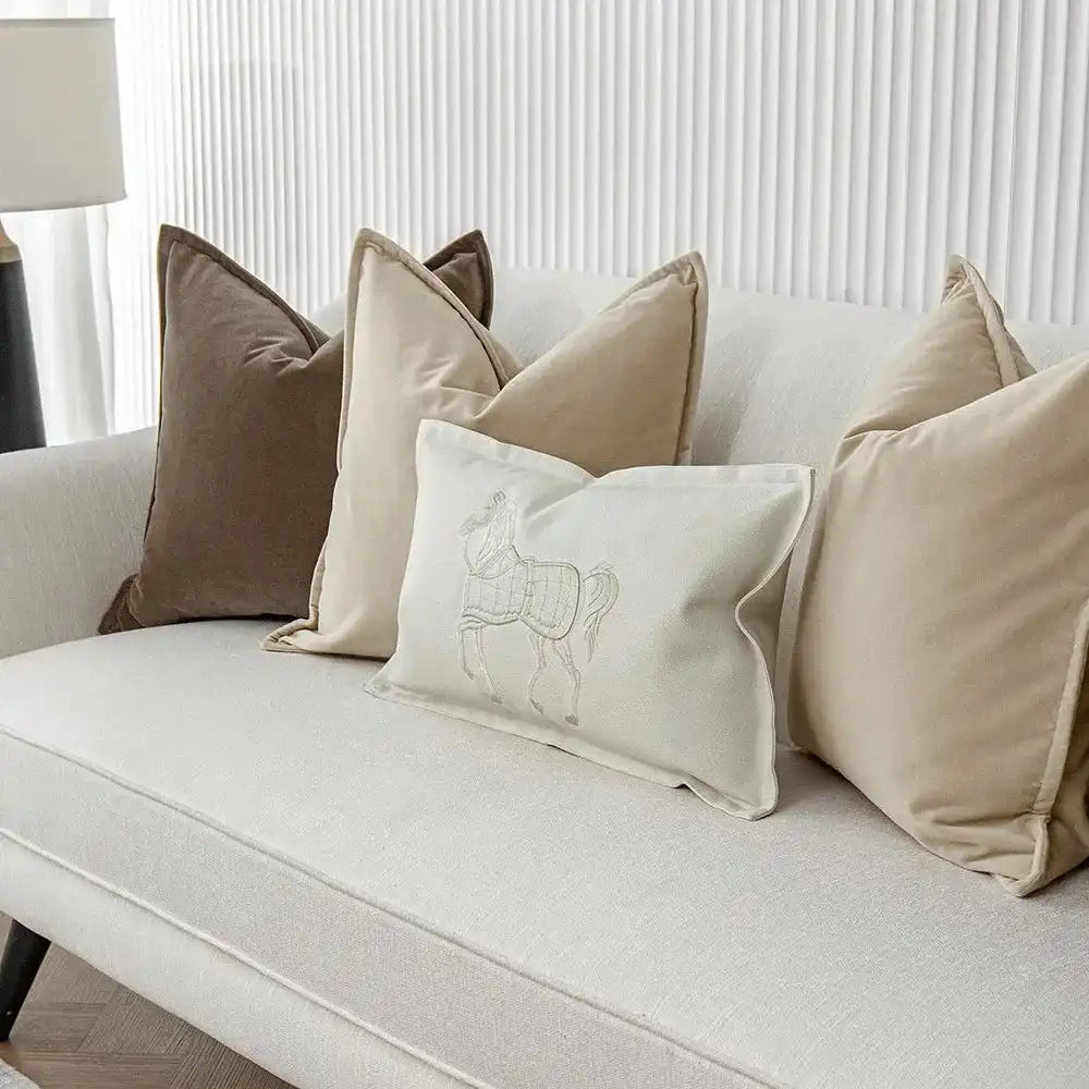 Design: Two light beige velvet cushions, two brown velvet cushions and a PU accent cushion with horse motif
