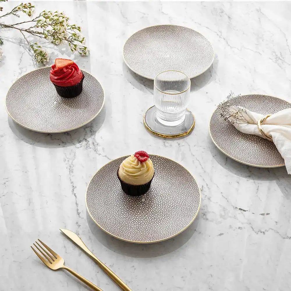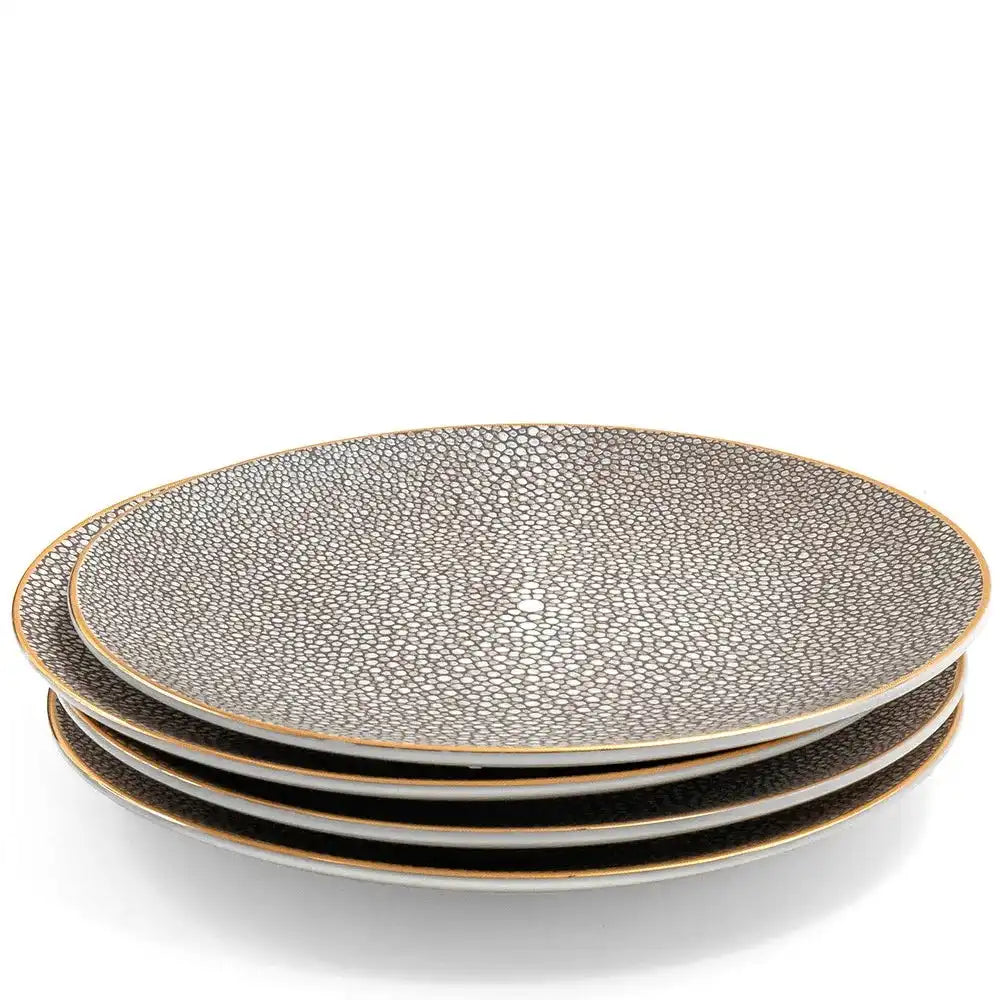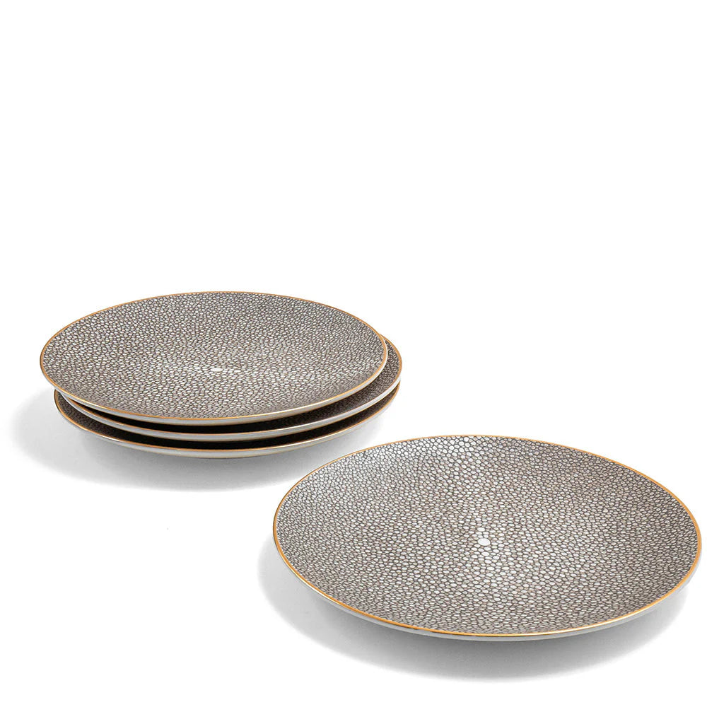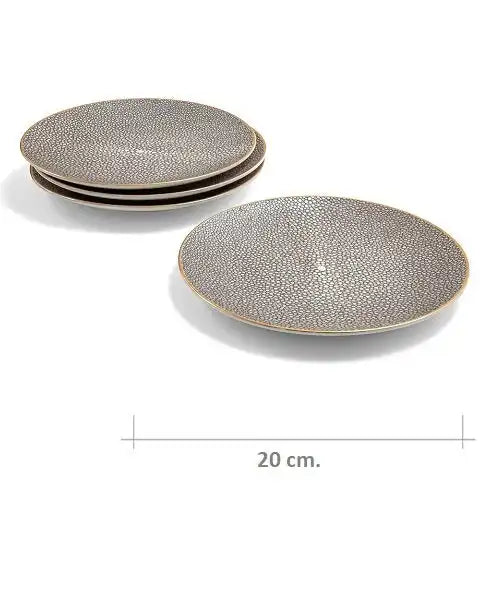 This porcelain set includes four small plates made from genuine bone china with a glaze finish. Hand painted for a premium feel, they feature an organic dot design, like small pebbles, all over.