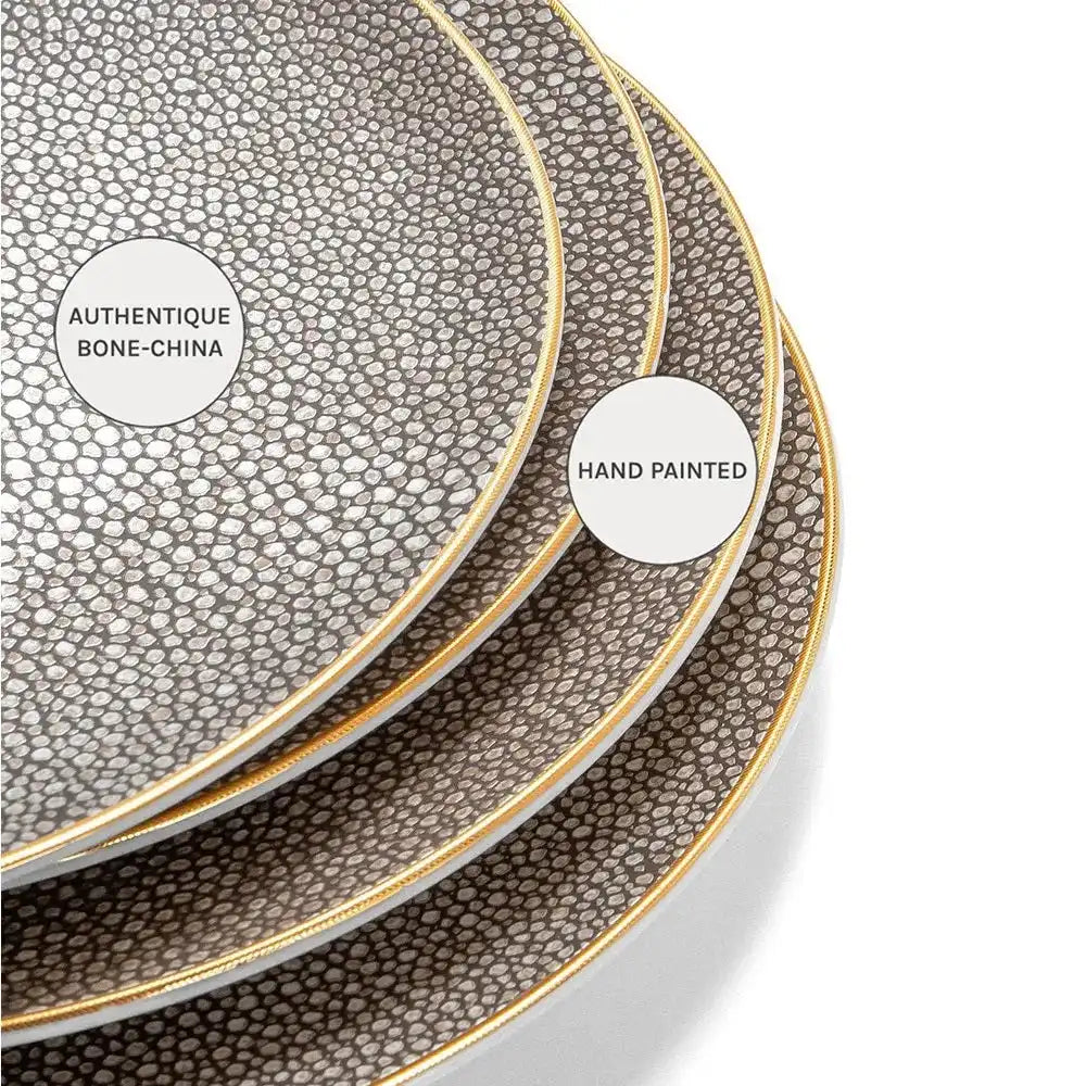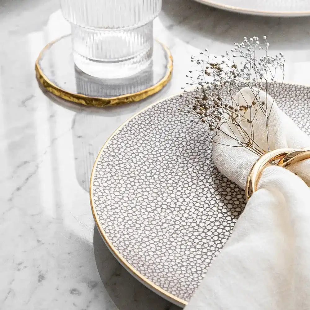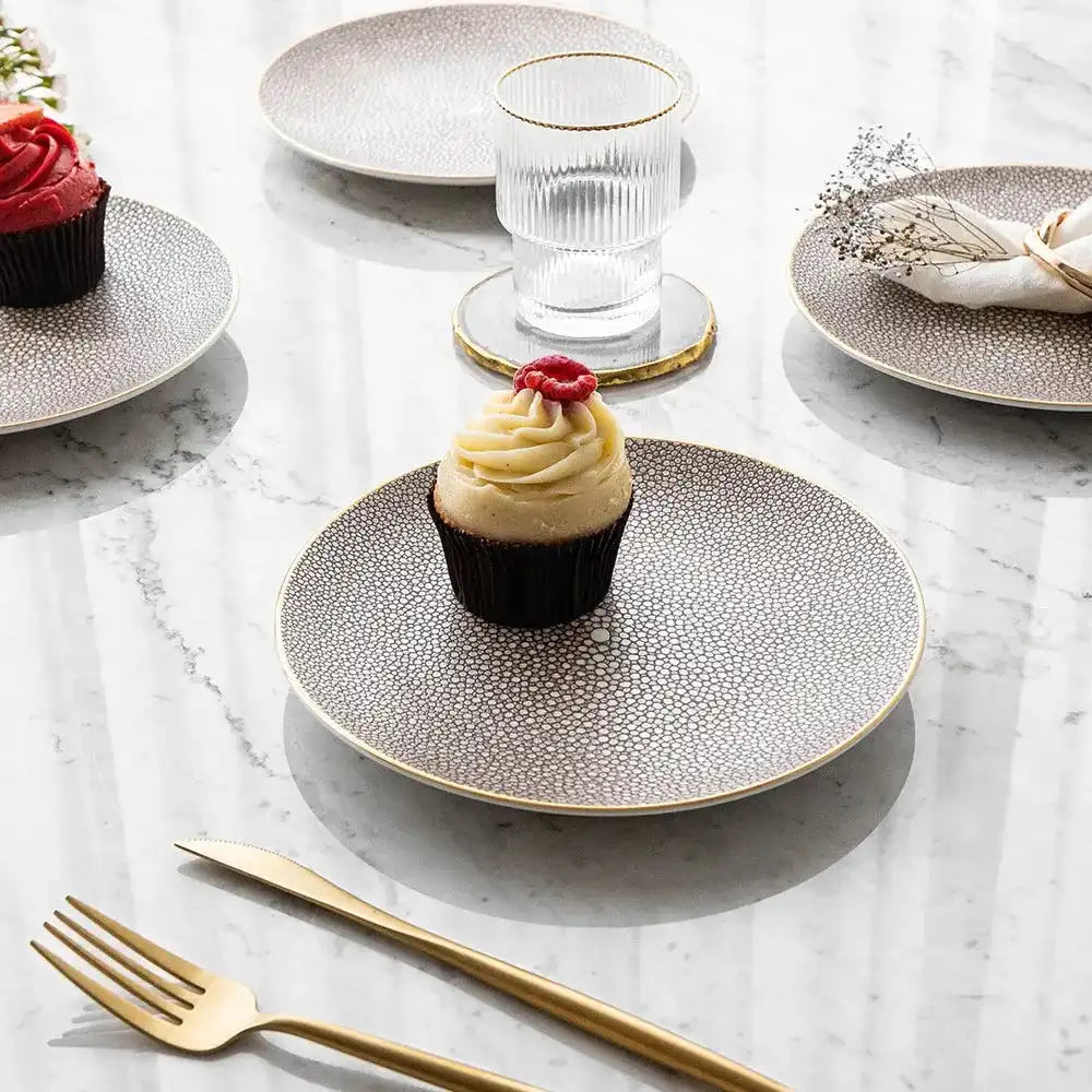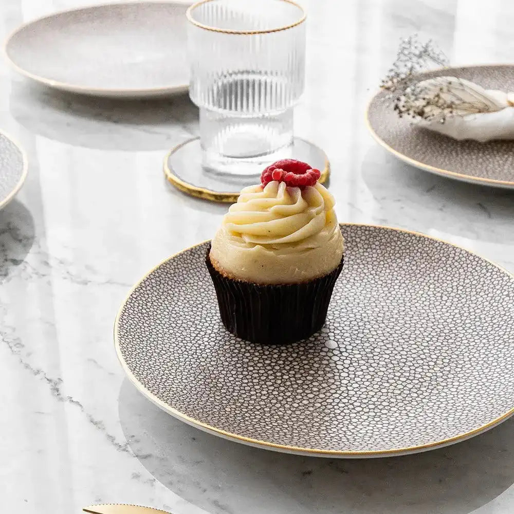 This porcelain set includes four small plates made from genuine bone china with a glaze finish. Hand painted for a premium feel, they feature an organic dot design, like small pebbles, all over.
