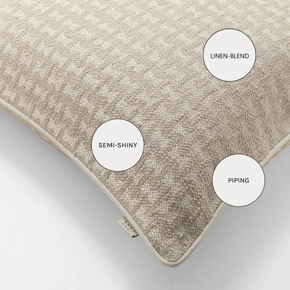 A soft , textured cushion in a calm neutral tone, woven with a refined houndstooth effect that gives depth without feeling busy, The handfeel is plush and elevated, perfect for layered styling