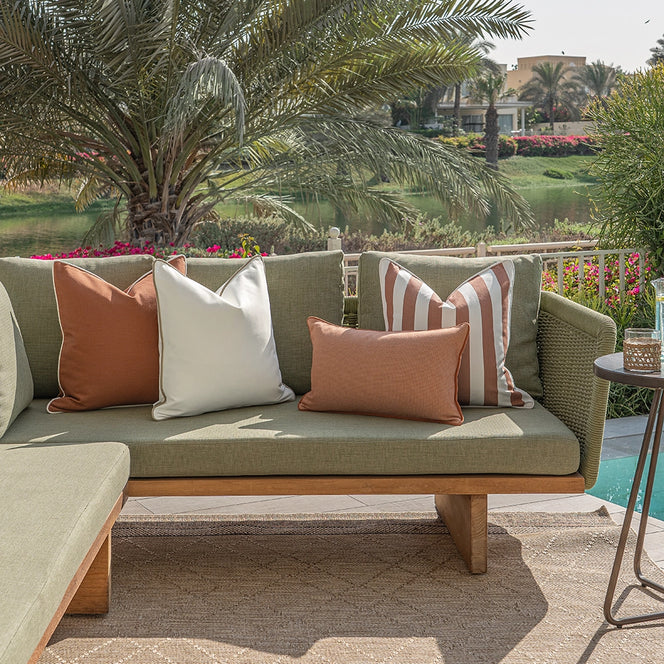 Warm, earthy colours meet bold, modern stripes in this outdoor cushion set. Expertly blending plain and striped cushions, this ivory and rust cushion bundle will transform any patio.
