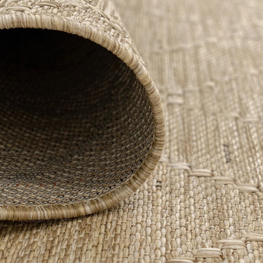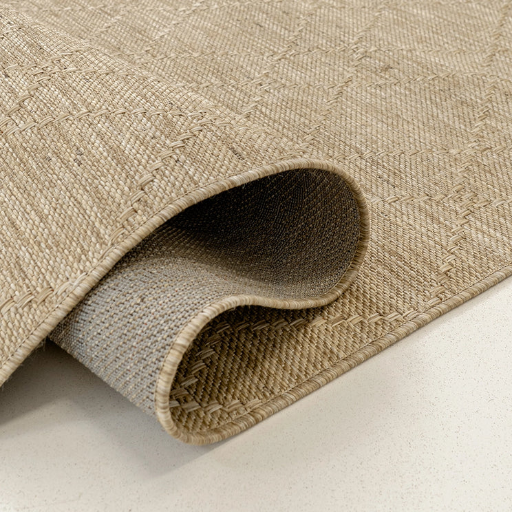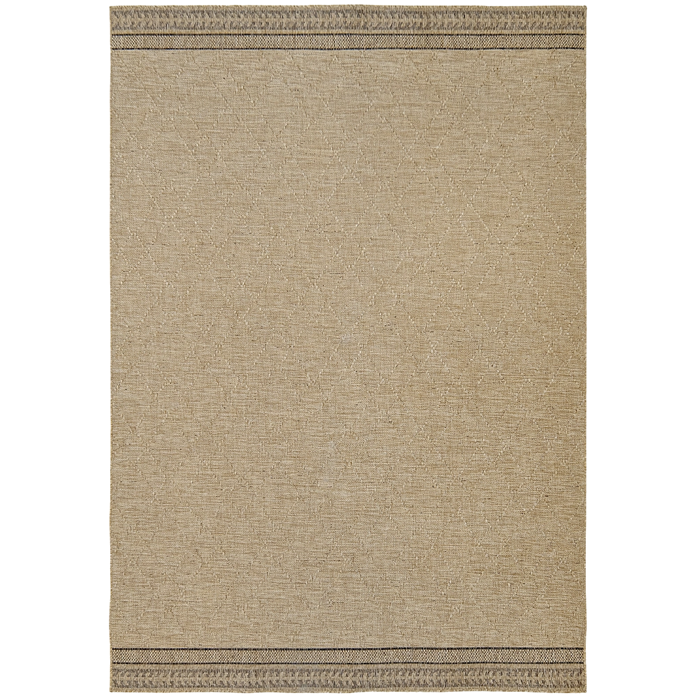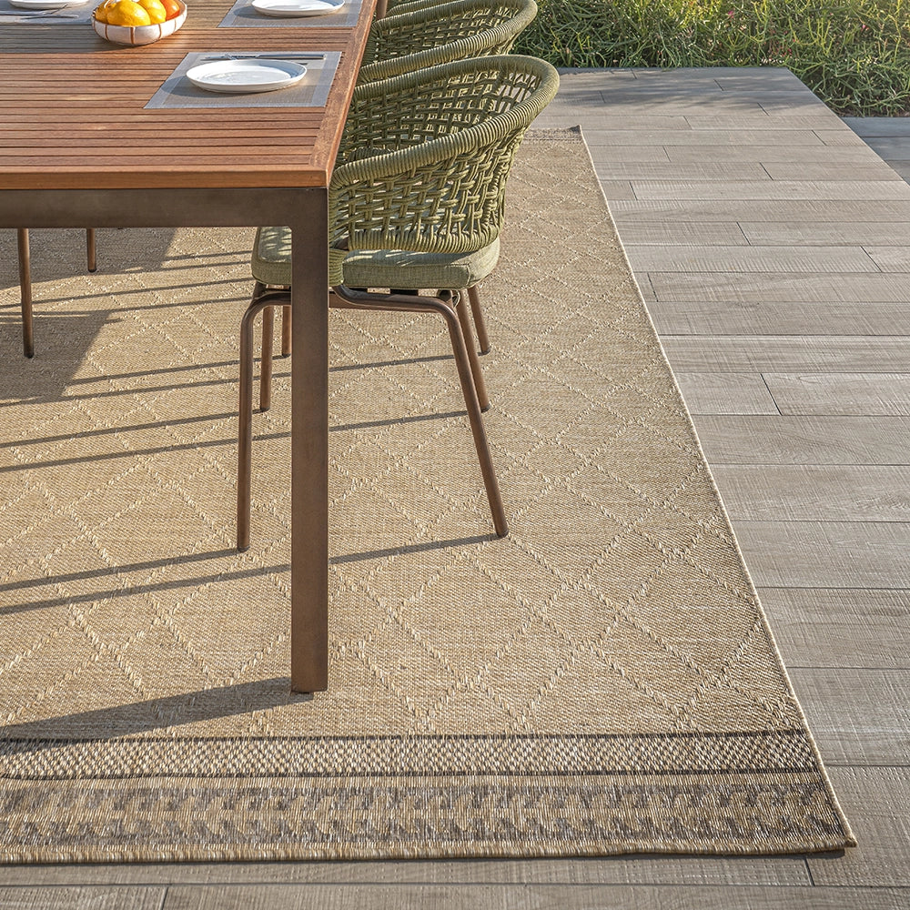 An indoor–outdoor rug in a natural camel-brown tone, featuring a subtle diamond weave framed by deep brown borders that verge on black. Its design balances earthy warmth with durable practicality.