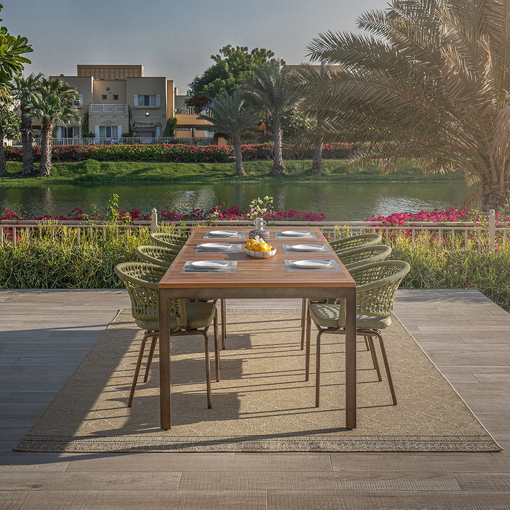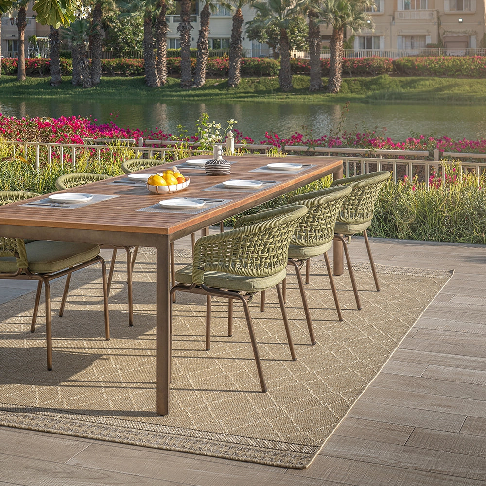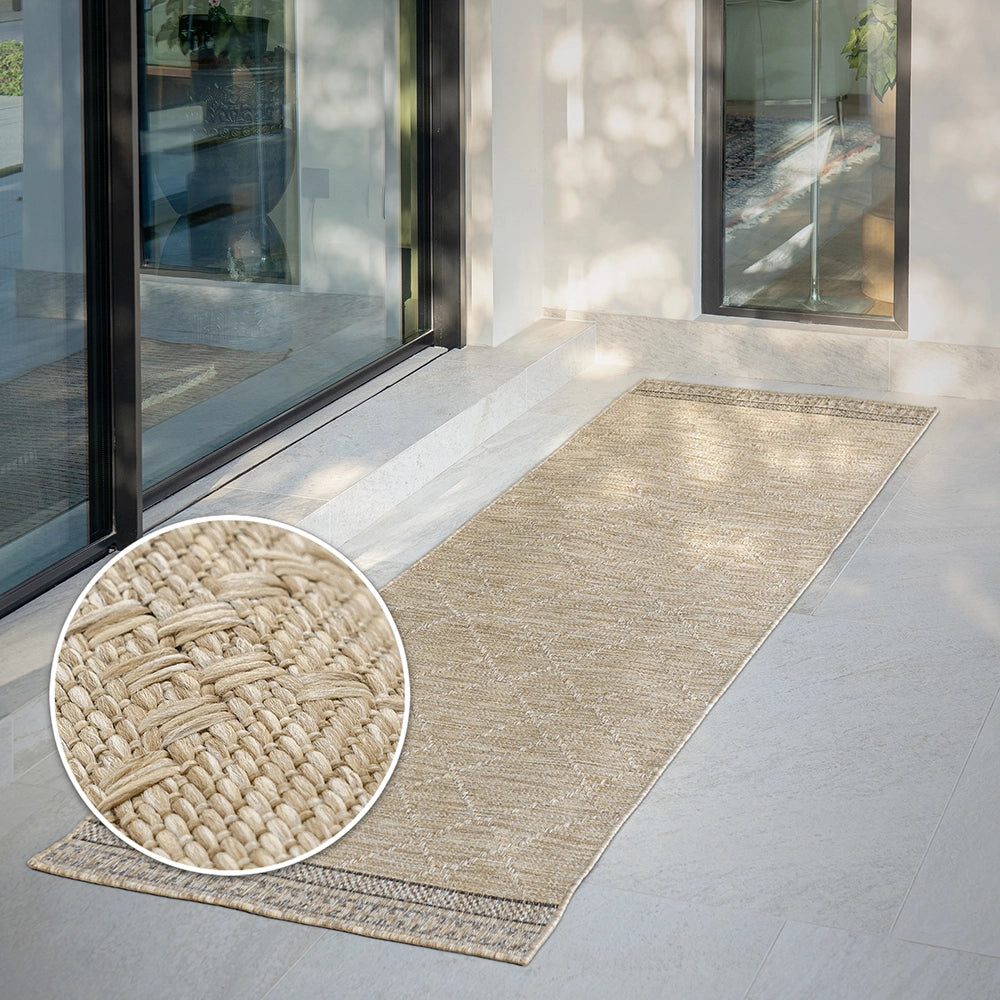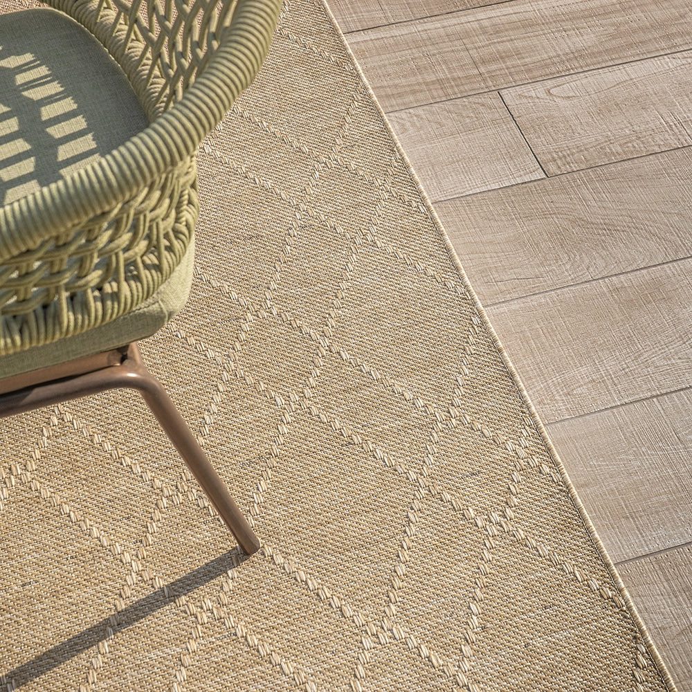 Design: Diamond-patterned flatweave with contrasting dark borders, crafted for both indoor comfort and outdoor endurance.