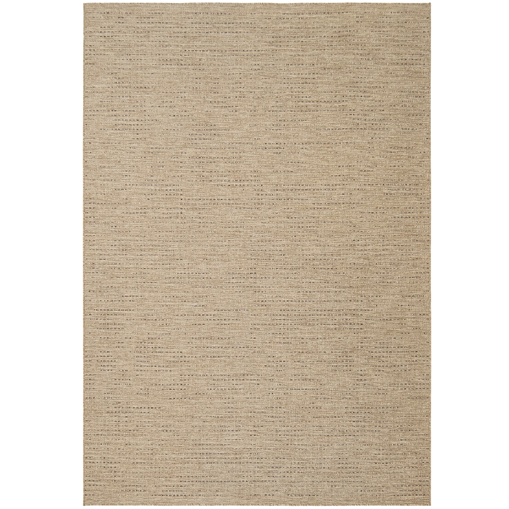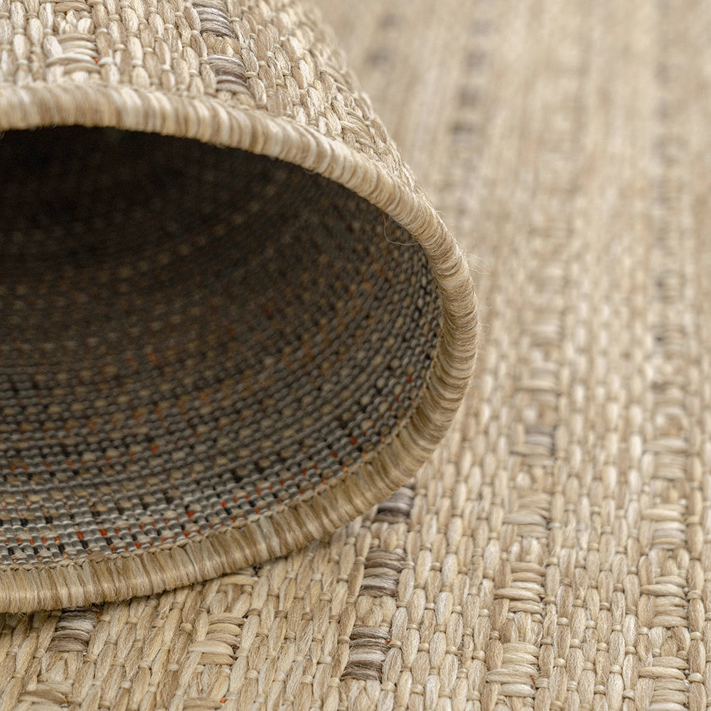 A close-up of the natural camel-brown indoor–outdoor rug, revealing its finely woven linear texture with subtle tonal variation. The durable flatweave design balances warmth, simplicity, and easy maintenance.
