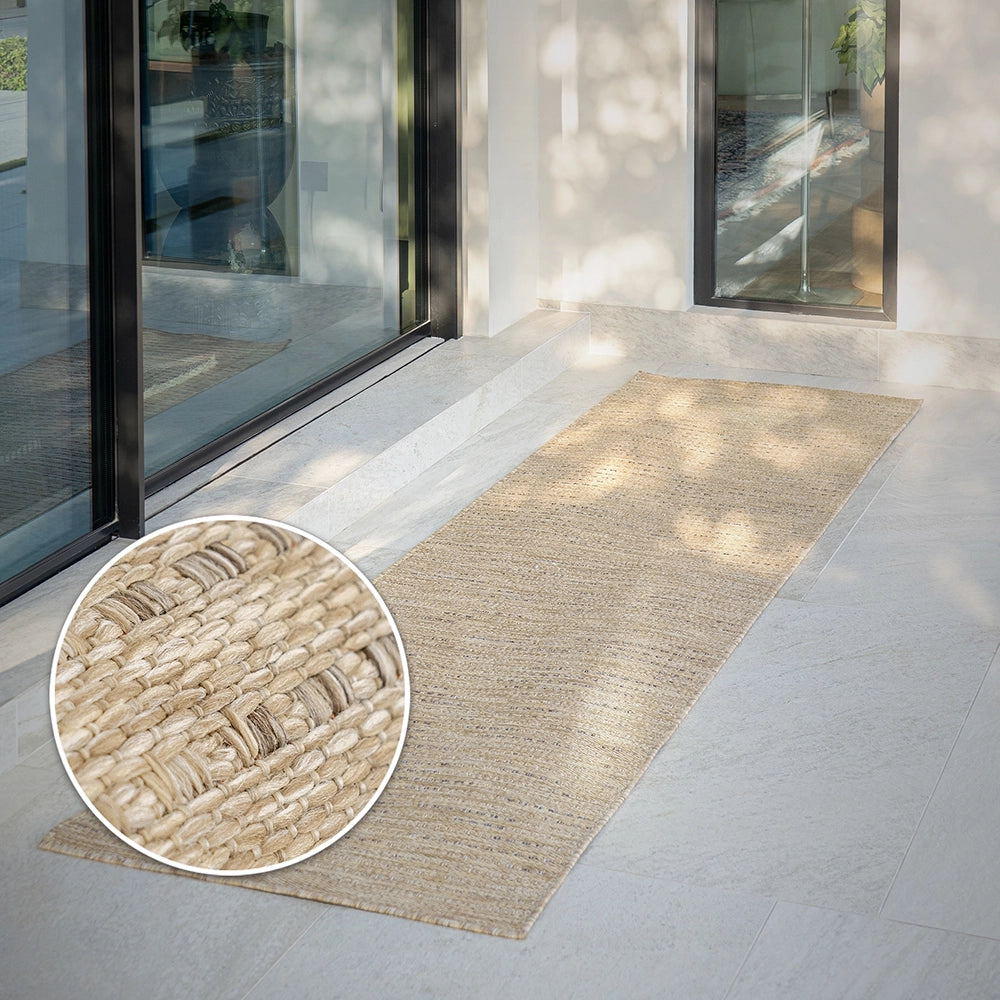 A close-up of the natural camel-brown indoor–outdoor rug, revealing its finely woven linear texture with subtle tonal variation. The durable flatweave design balances warmth, simplicity, and easy maintenance.