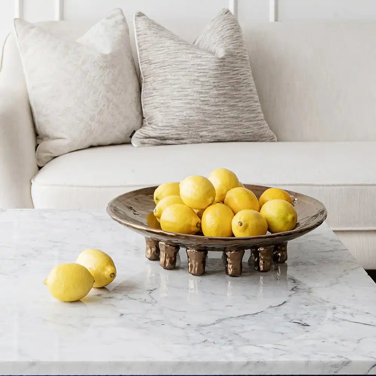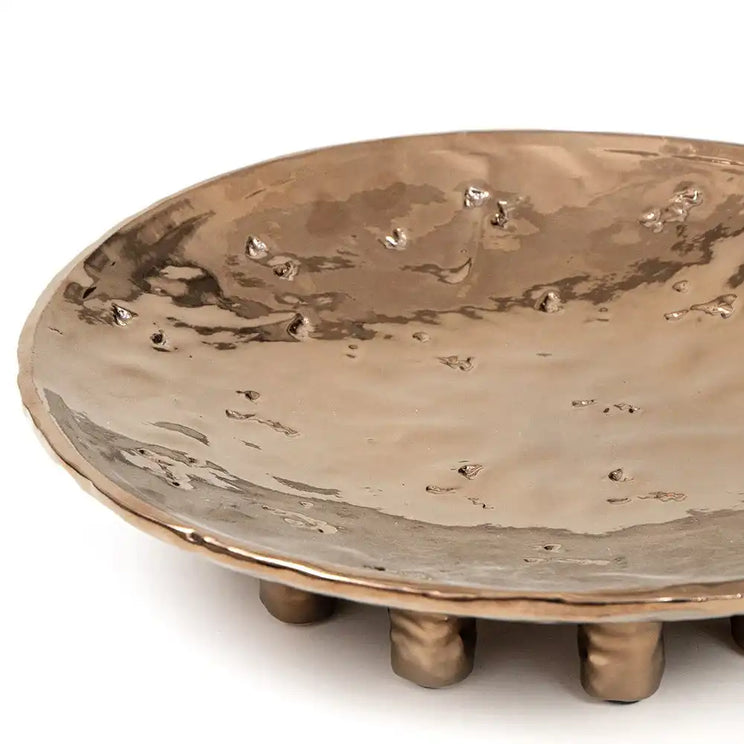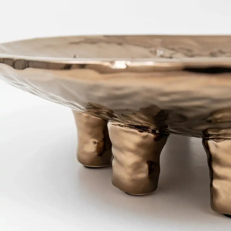 Designed to look like hammered copper, this large flat bowl stands on a circle of small legs. Filled with fruit or pot pourri, it makes a wonderful centrepiece for your coffee table.