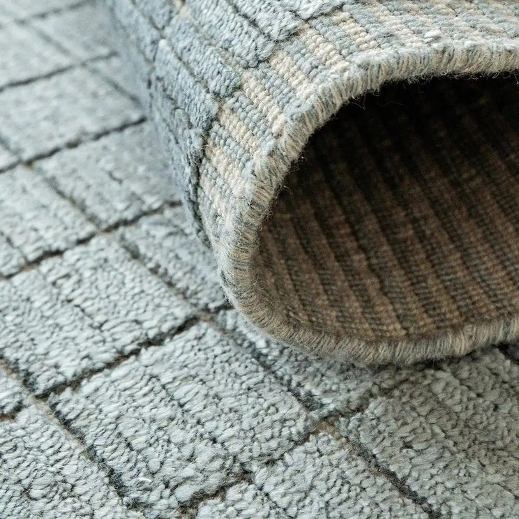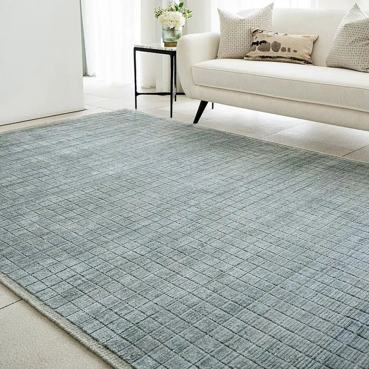 This blue and grey carpet combines a textured grid pattern with premium materials to define modern luxury.