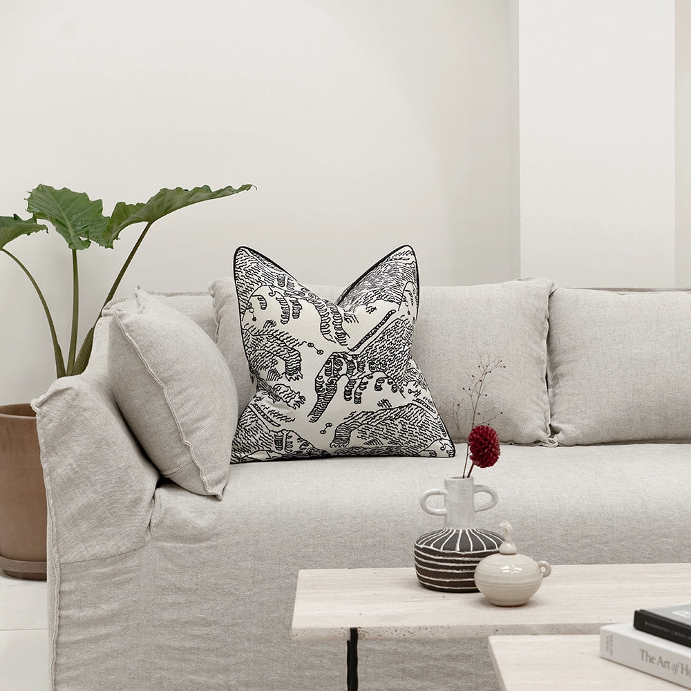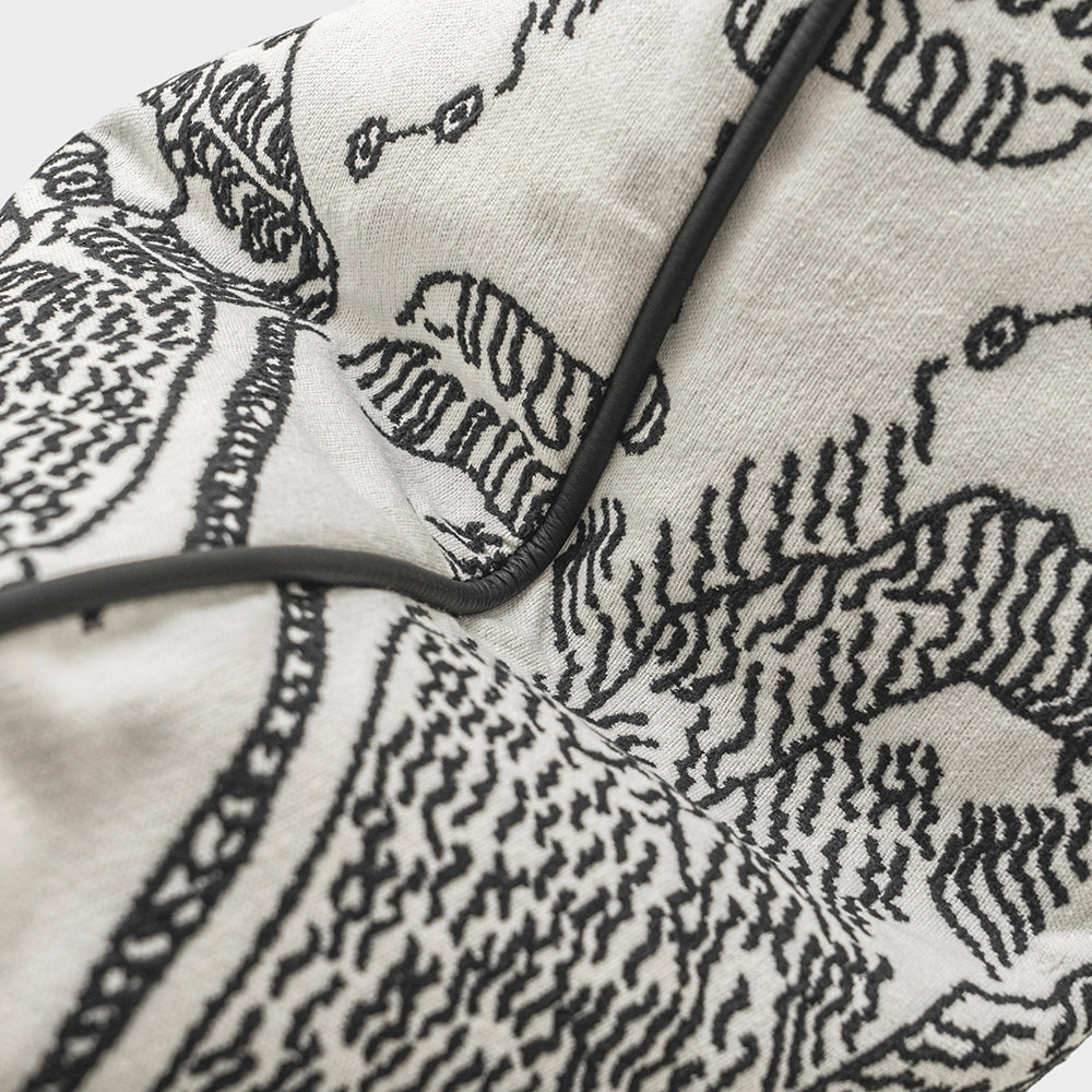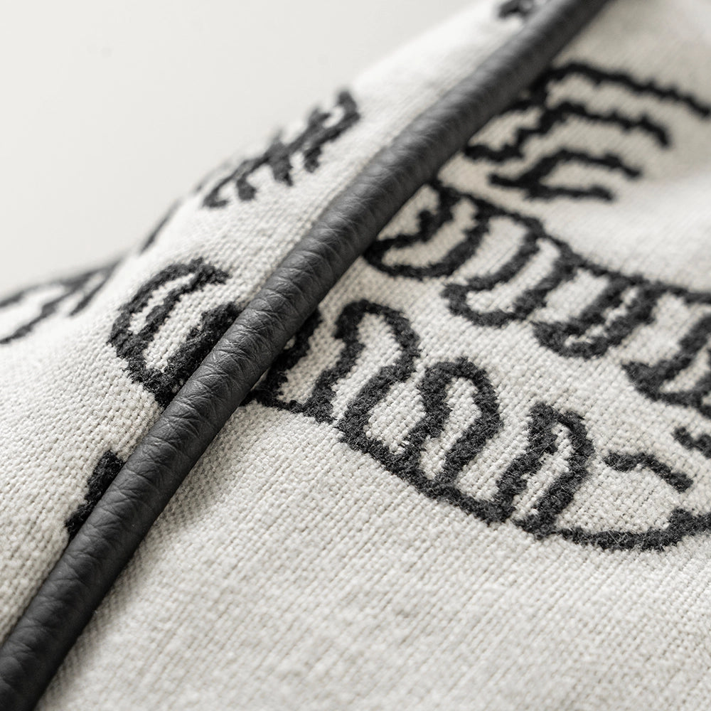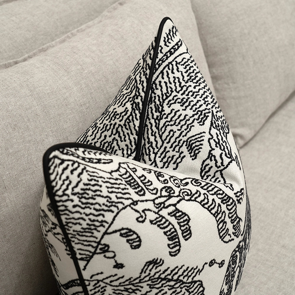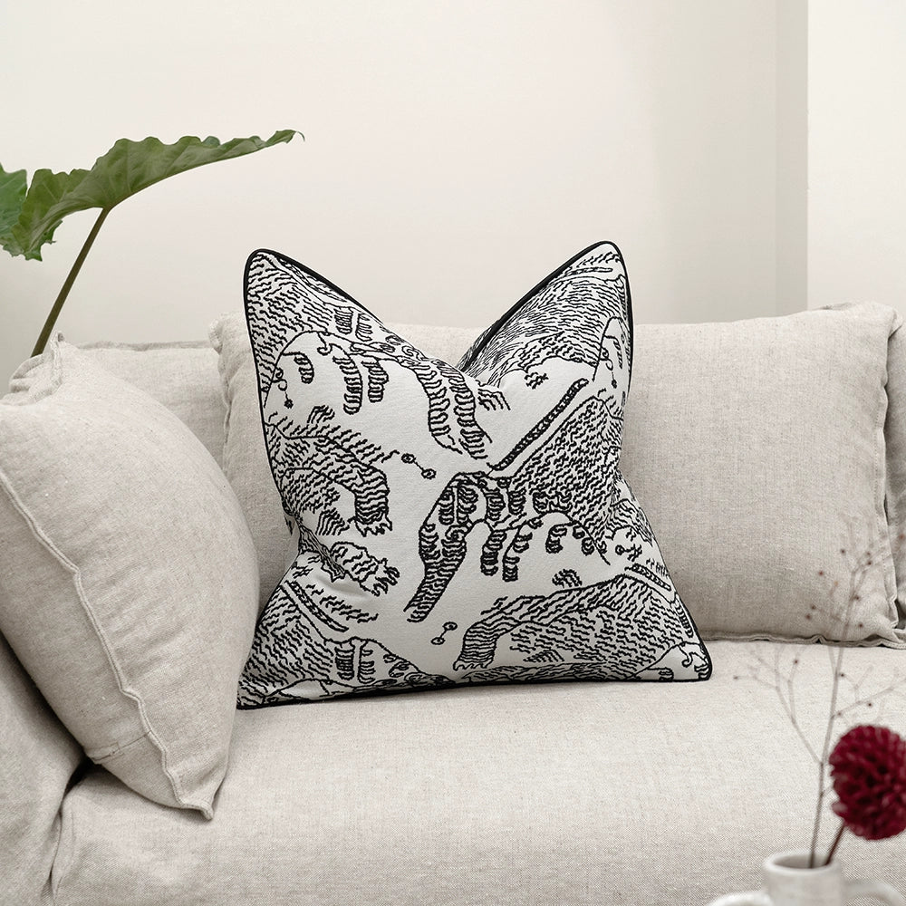 This black and white cushion has a line drawn pattern that's full of life and movement. With contrast faux leather piping all the way around, it's an instant refresh for your living space.