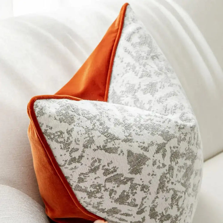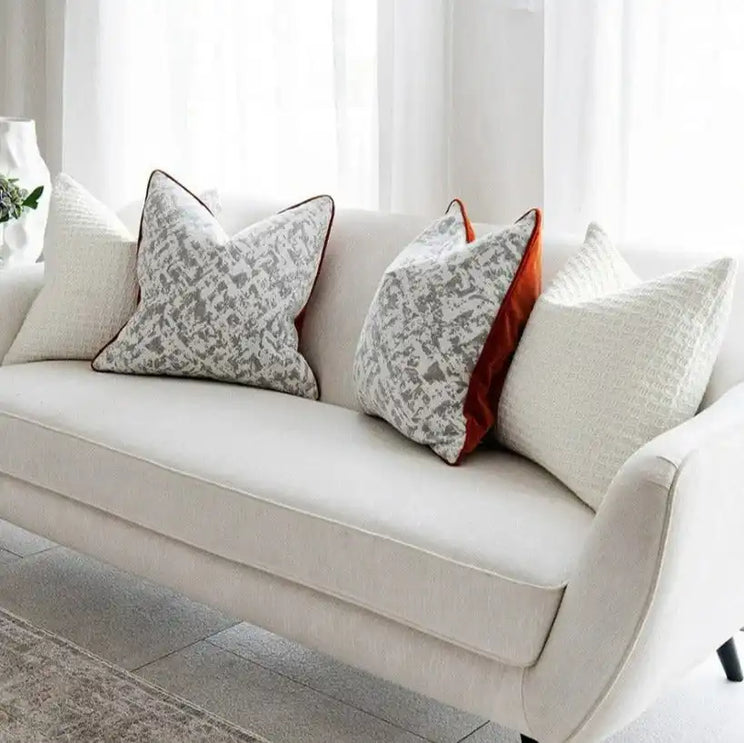 This bundle includes two white jacquard cushions and two grey and white cushions with an orange velvet back and piping for a burst of colour. It’s a beautiful way to brighten up your living space.