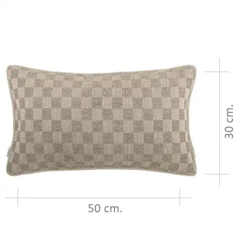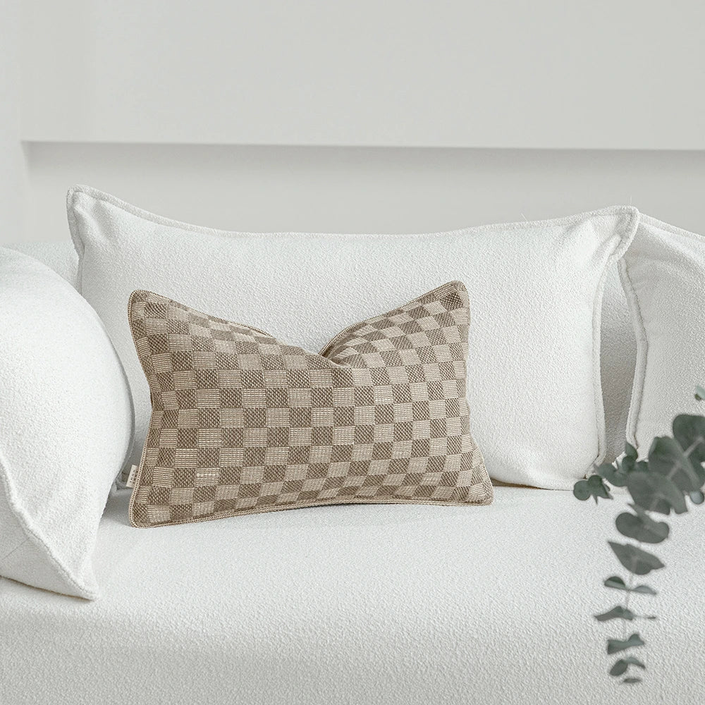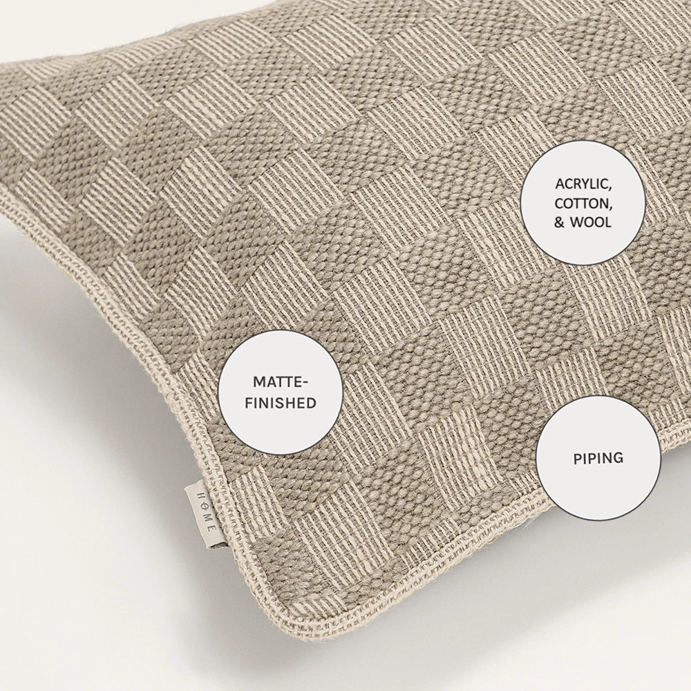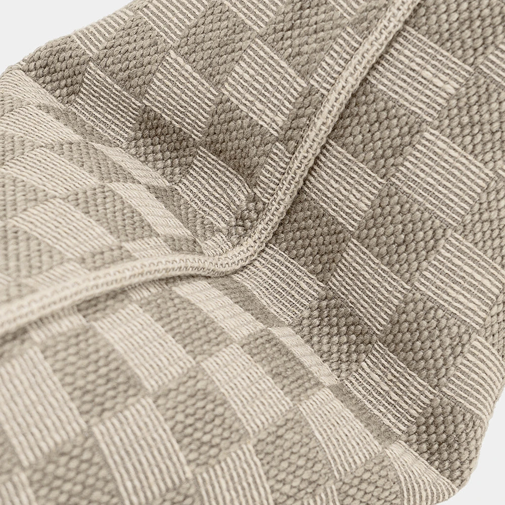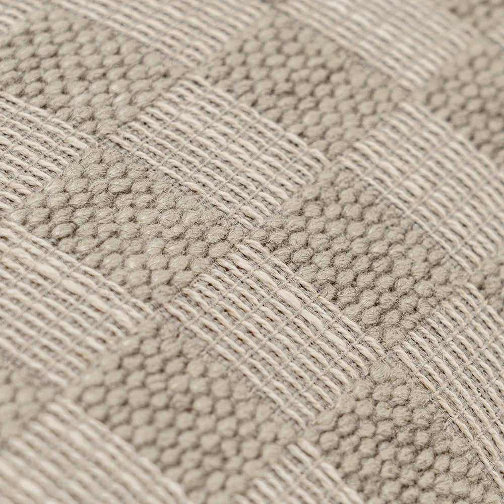 Design: Designed with a modern checkerboard weave, alternating between smooth and tactile squares for subtle depth. The pattern is fully woven—not printed—giving it a rich artisanal character. Finished with a matching edge for a clean, cohesive look that blends seamlessly into layered interiors.