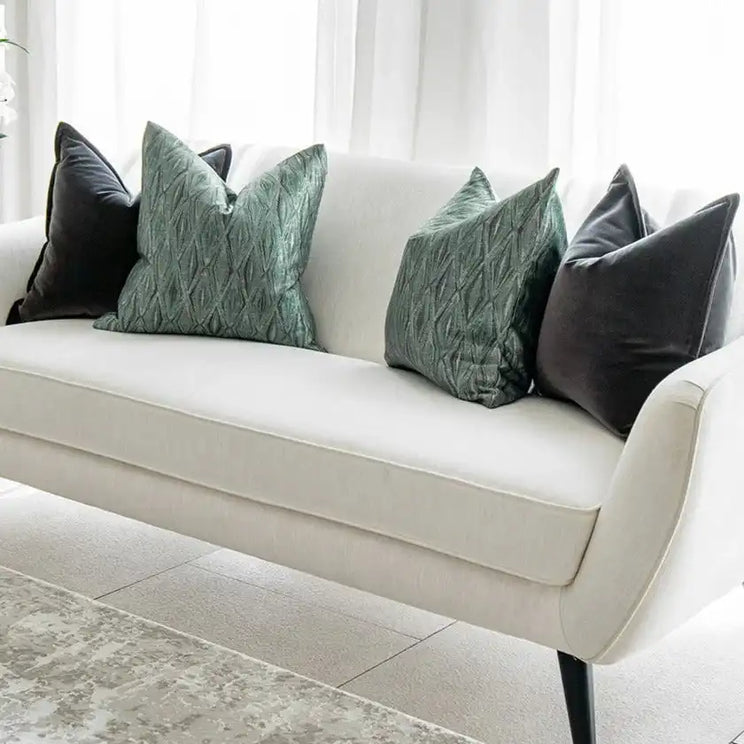 Green and serene, our Gary cushion bundle includes two dark grey cushions in plush cotton velvet, and two coordinating shiny cushions with a diamond pattern in green, black and grey.