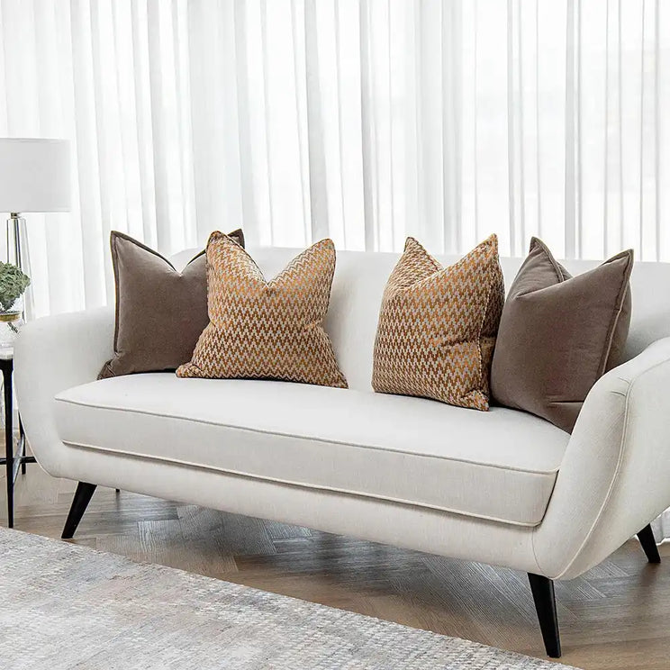 Our Vicente cushion bundle combines two plush velvet cushions in a rich shade of brown with two modern cushions with a zigzag pattern in silver and bright orange. It’s an eye-catching combination.