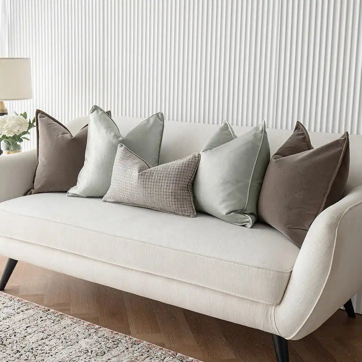 In a considered colour combination of brown, beige and blue, our Amaris cushion bundle pairs two velvet cushions with two shiny art silk cushions and a dogtooth check accent cushion.