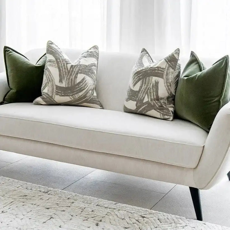 Design: Two forest green velvet cushions and two grey and white brushstroke patterned cushions