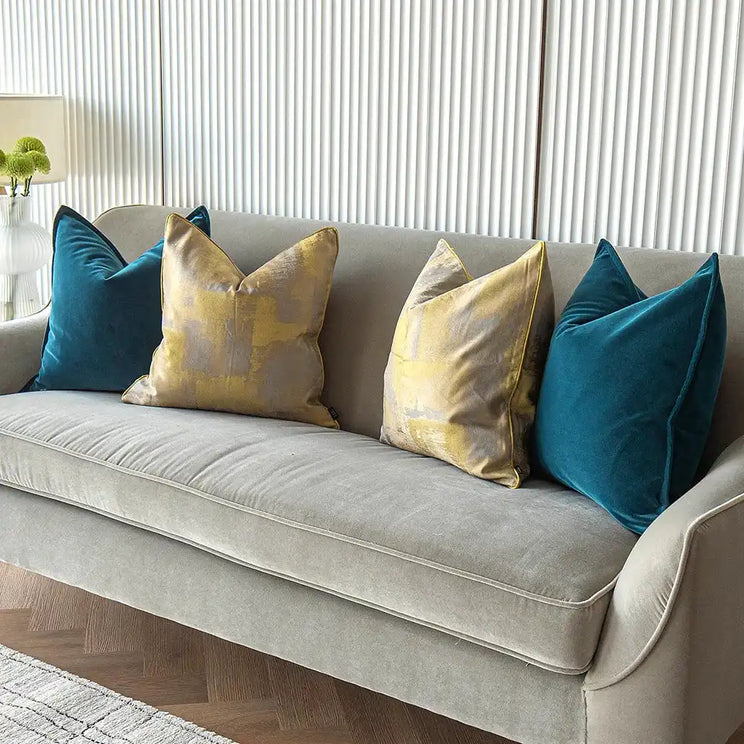 Design: Two icy blue velvet cushions and two yellow and grey brushstroke pattern cushions