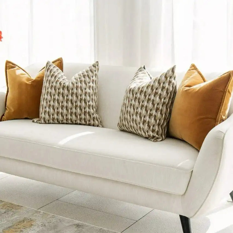 Design: Two orange velvet cushions and two brown and white 3D pattern cushions
