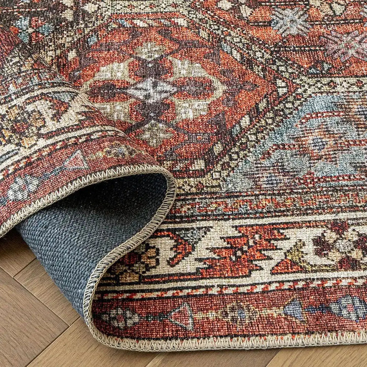 In a vibrant mix of reds with accents of blue and green, this colourful rug will brighten up your living space.
