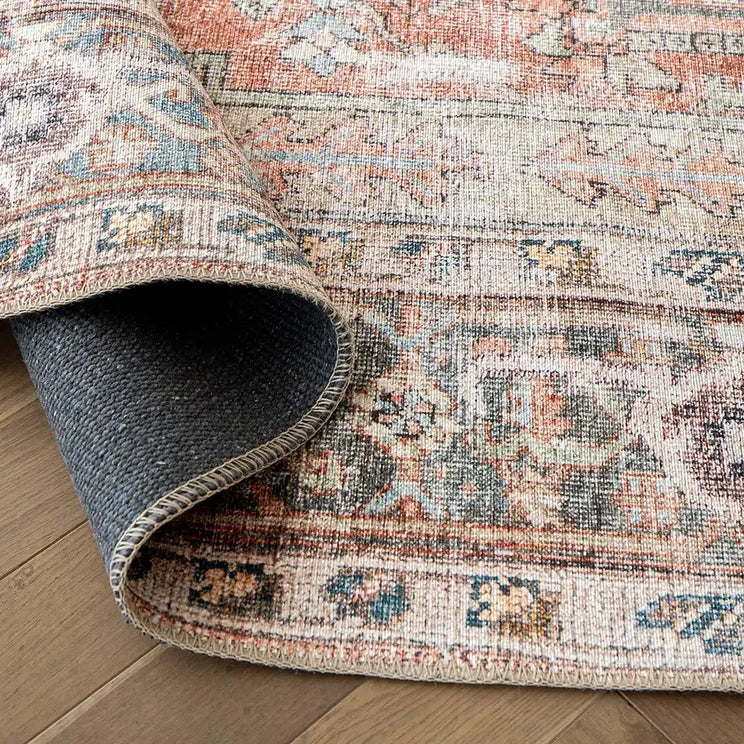 The red and blue shades of this patterned rug have been faded in places for a subtle wash of colour.