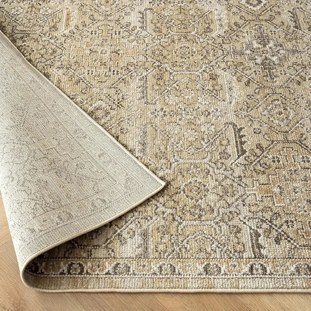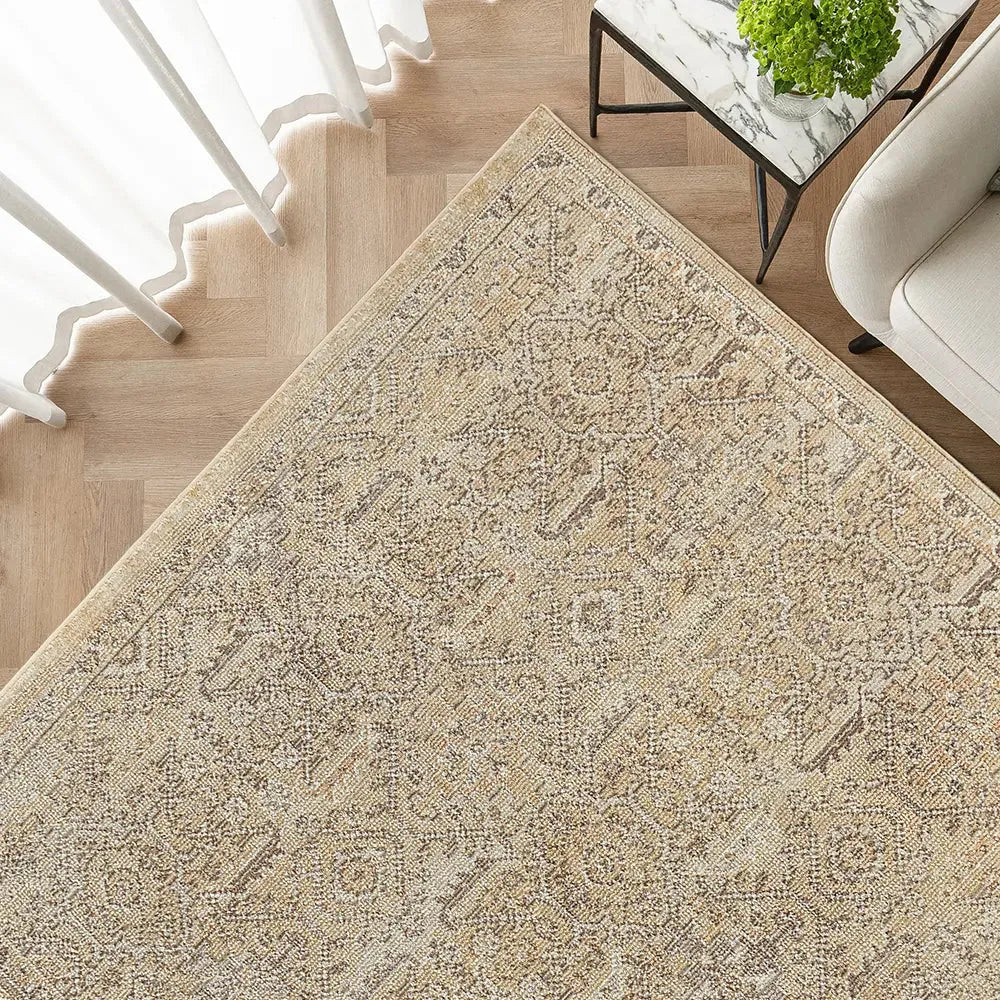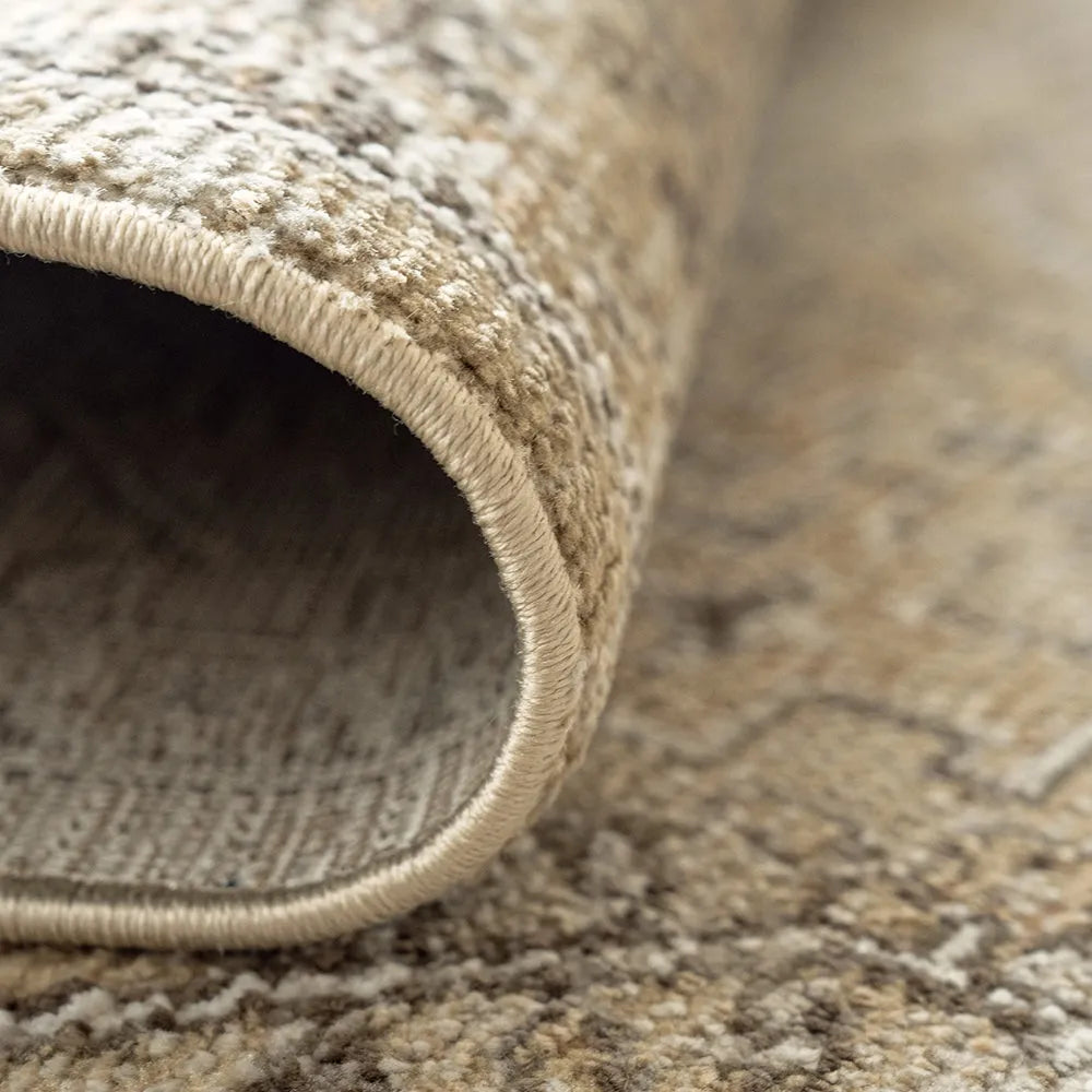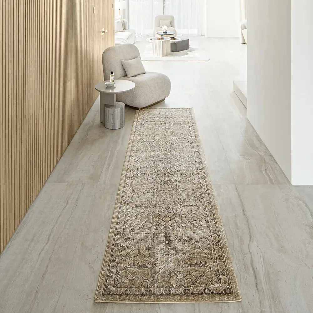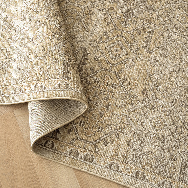 This vintage style carpet has a timeless quality you'll love. In a warm combination of golden brown and beige with fringing at each end, the patterned carpet will make any room feel more welcoming.