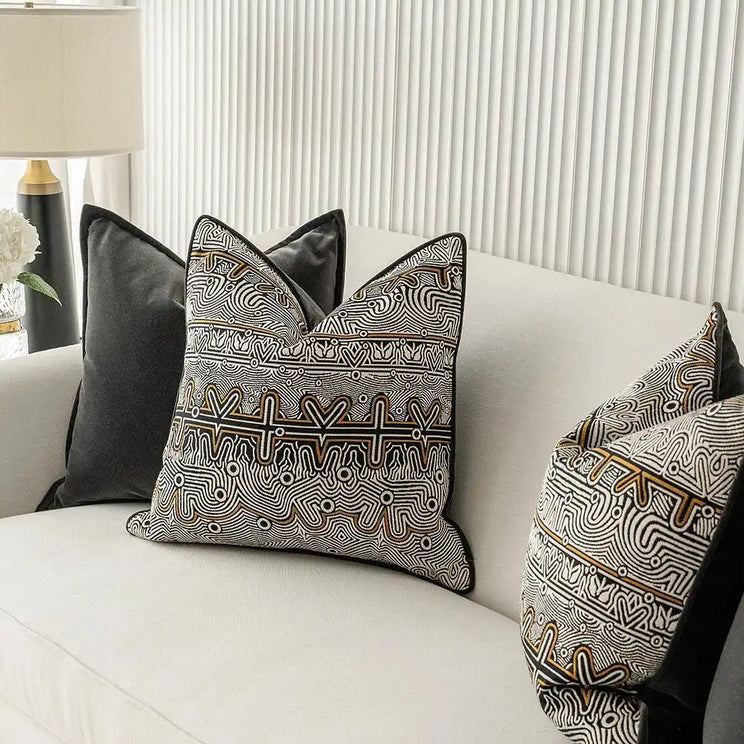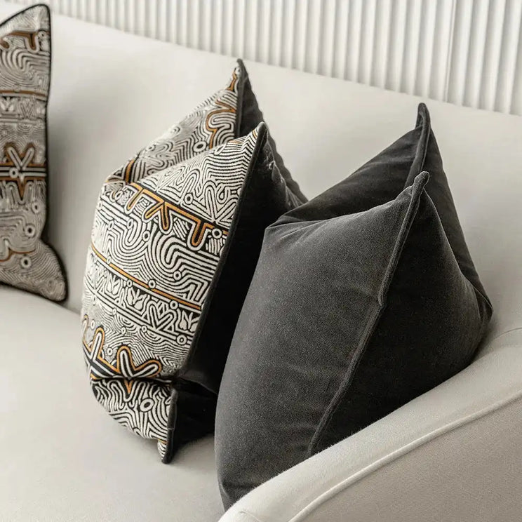 Design: Two dark grey velvet cushions and two tribal pattern cushions with velvet back